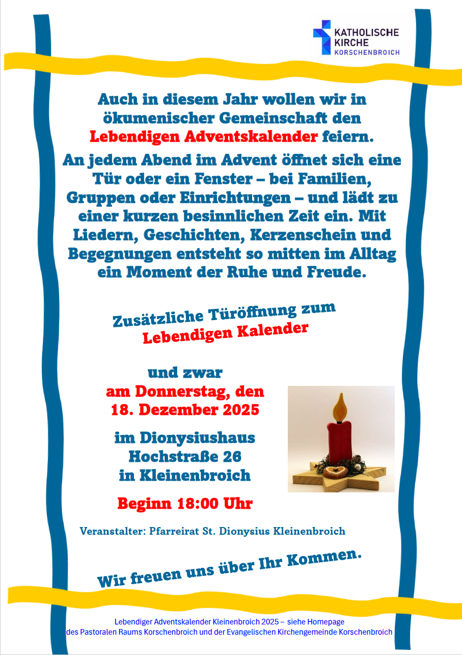 Am Donnerstag, dem 18. Dezember 2025, öffnen wir die Tür zum Dionysiushaus, Hochstr. 26, im Rahmen des Ökumenischen Lebendigen Adventskalenders.