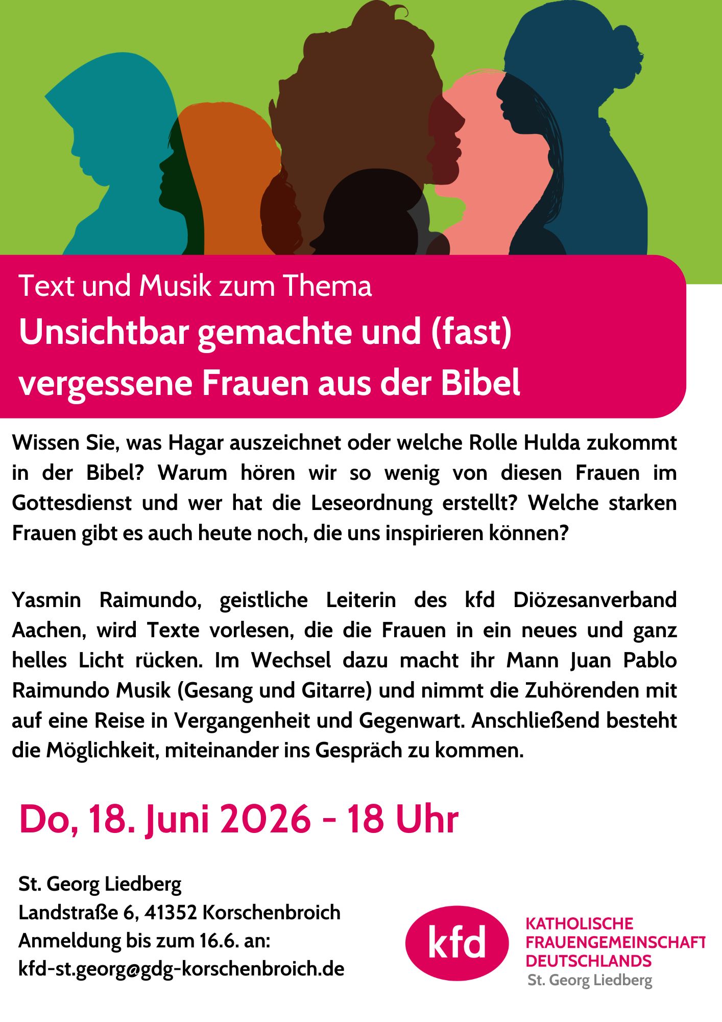 Yasmin Raimundo, geistliche Leiterin des kfd DV Aachen wird Texte vorlesen, die die Frauen in ein neues und ganz helles Licht rücken. Im Wechsel dazu macht ihr Ehemann Juan Pablo Musik (Gsang und Gitarre)und nimmt die Zuhörenden mit auf eine Reise in Vergangenheit und Gegenwart.